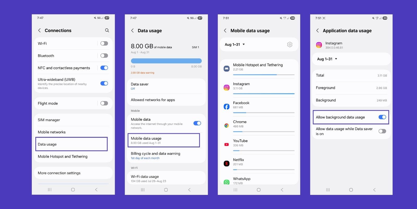 Limit background data usage for apps: Many apps refresh content in the background even when you're not using them. Turn this off for apps you don't need constantly updated.
